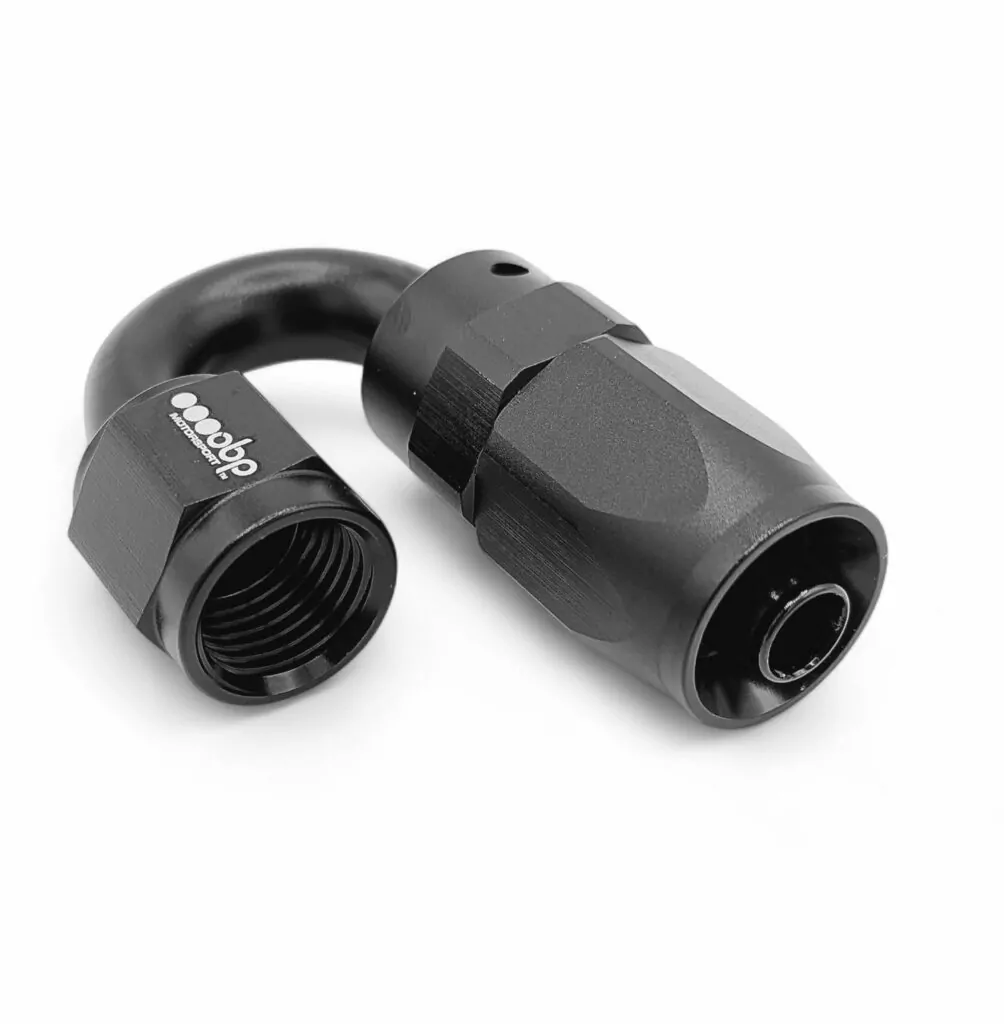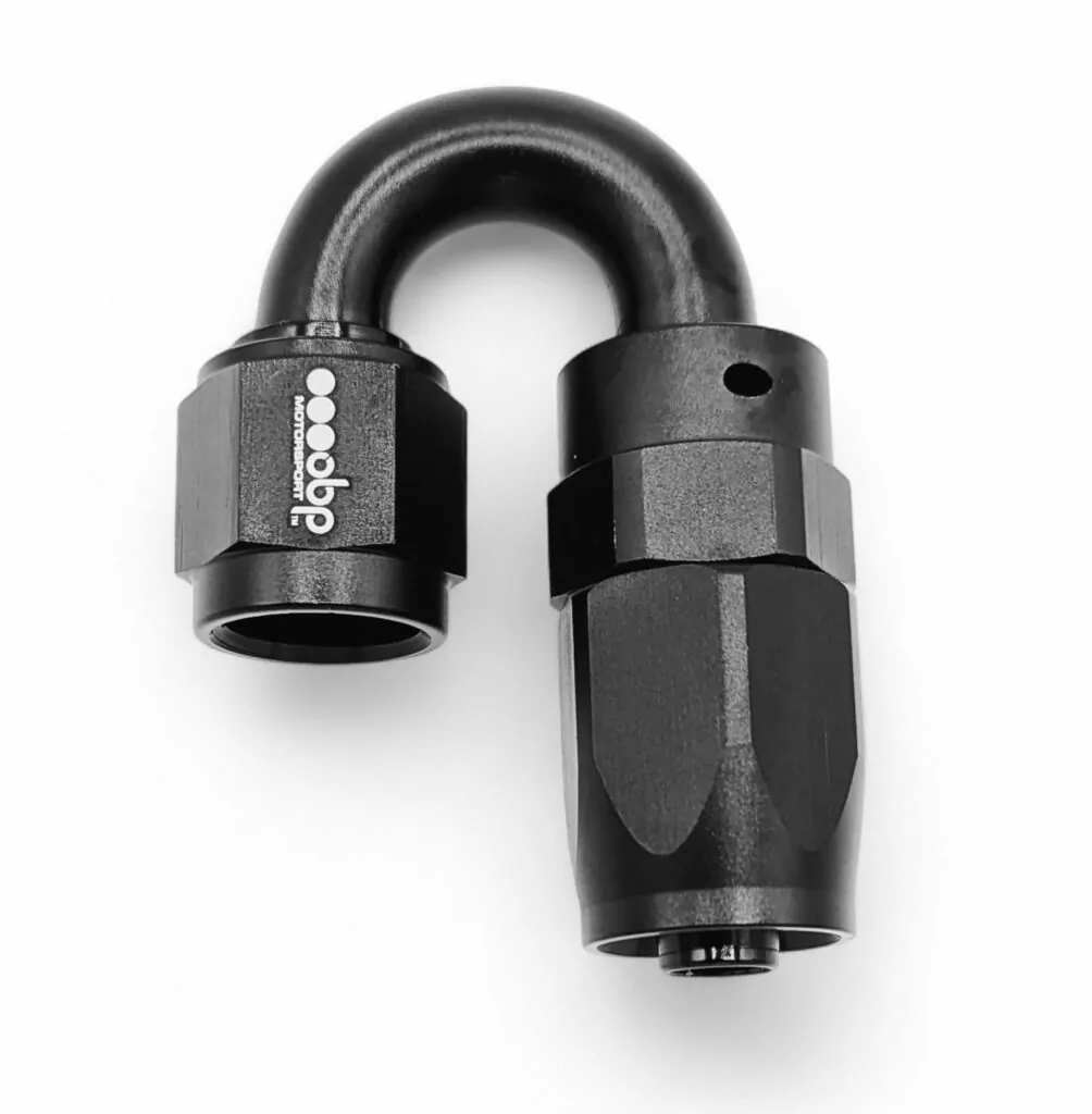 The 180° Aluminium Stealth Black AN Fuel Hose Fitting from obp Motorsport is engineered for applications requiring tight-radius turns and direct return line routing in high-performance fuel, oil, or coolant systems. Ideal for compact engine bays or systems with limited space, the 180° design allows the hose to double back cleanly without kinks or flow restriction.