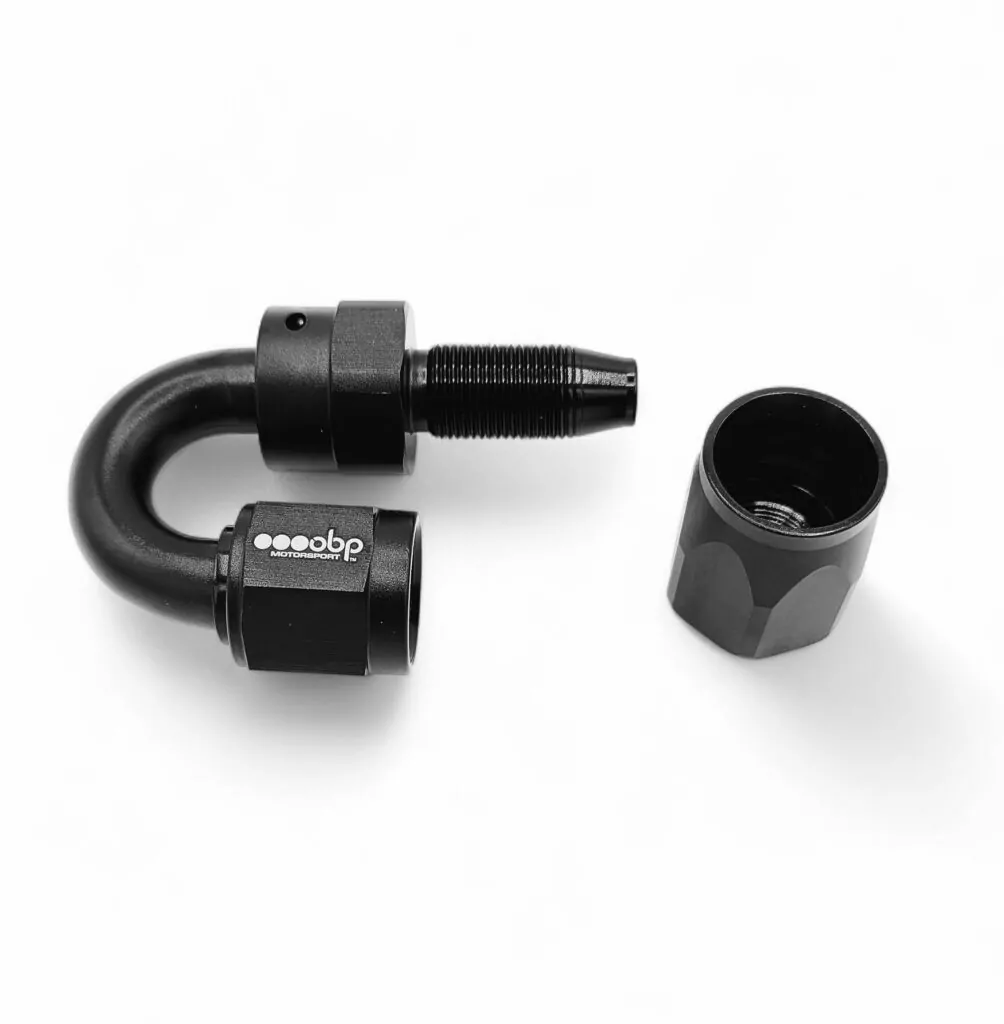 Manufactured from premium CNC-machined 6061 aluminium, this fitting features a tough, corrosion-resistant stealth black anodised finish, offering both long-term durability and a professional aesthetic. The twin swivel cutter design ensures a leak-free, secure, and reusable connection to obp Motorsport’s CPE braided rubber hose, even under high pressure and vibration.