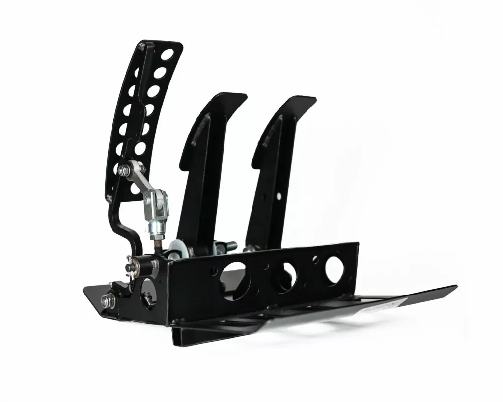 The Reinforced Mild Steel Pedals are fabricated with a strengthening plate on the rear to enable a strong arm for your pedal force. The pedals are curved pedal pads for comfort and gripped tape. The clutch pedal also includes a stop on the rear to adjust the throw of the pedal.